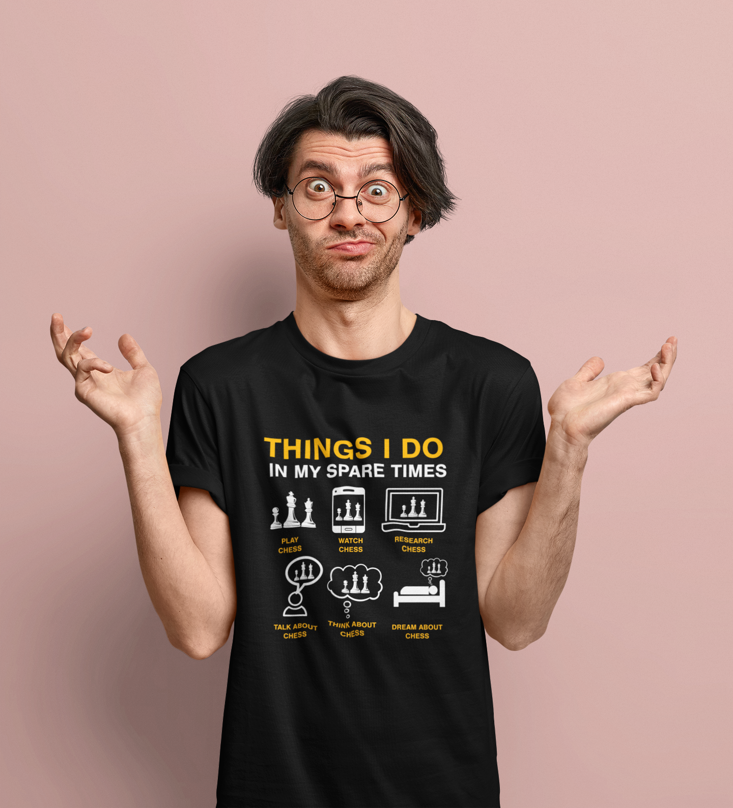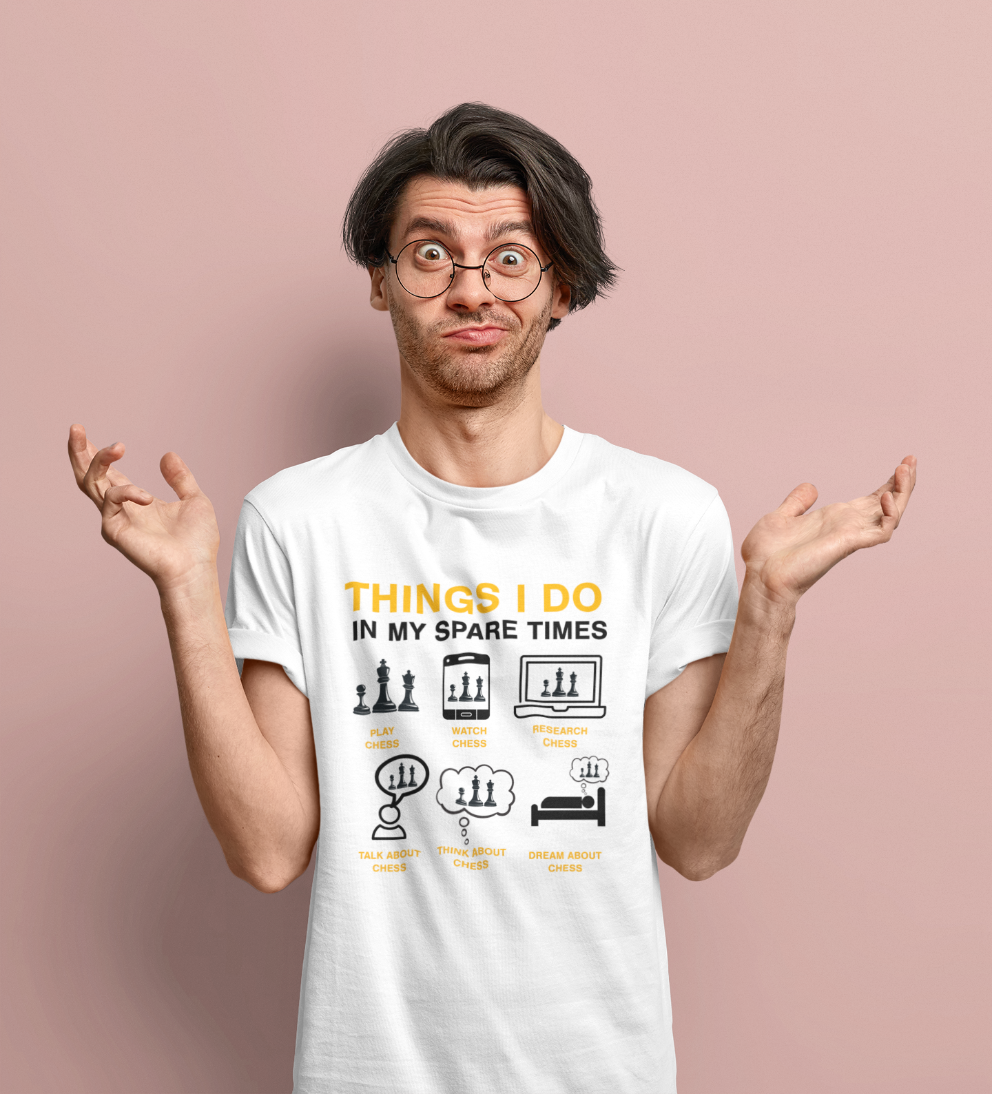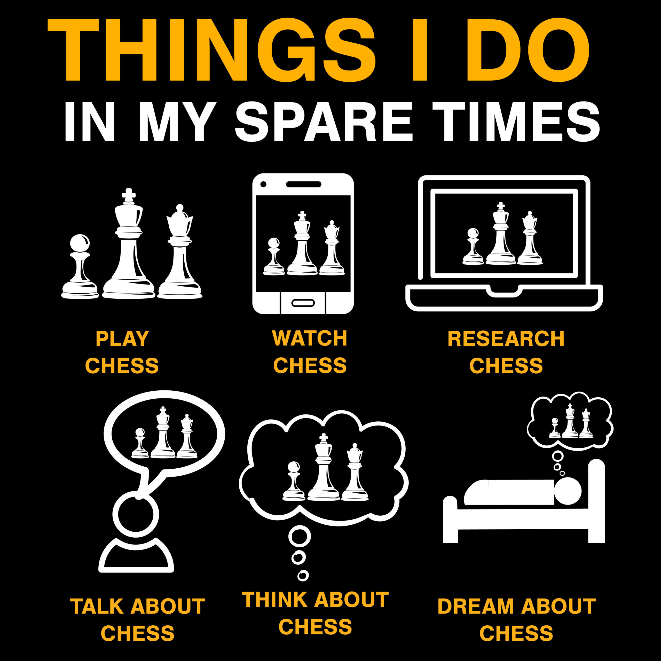 Ta majica je popolna izbira za vse ljubitelje šaha. Na sprednji strani je zabaven in domiseln napis “Things I do in my spare times”, pod njim pa ilustracije, ki prikazujejo vsakodnevne “aktivnosti” pravega šahovskega navdušenca: igranje, gledanje, analiziranje, pogovarjanje, razmišljanje in celo sanjanje o šahu. Združuje humor, stil in strast do igre – popoln kos za vsakogar, ki mu šah nikoli ne gre iz glave.